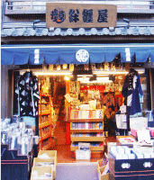 一番のおすすめ商品は、オリジナル本染鯉口シャツ。常時100柄ほど並んでいます。また、腹掛・股引・地下足袋等、祭衣装全般を取扱っていて、印伝袋物や、お誂え消札も人気!